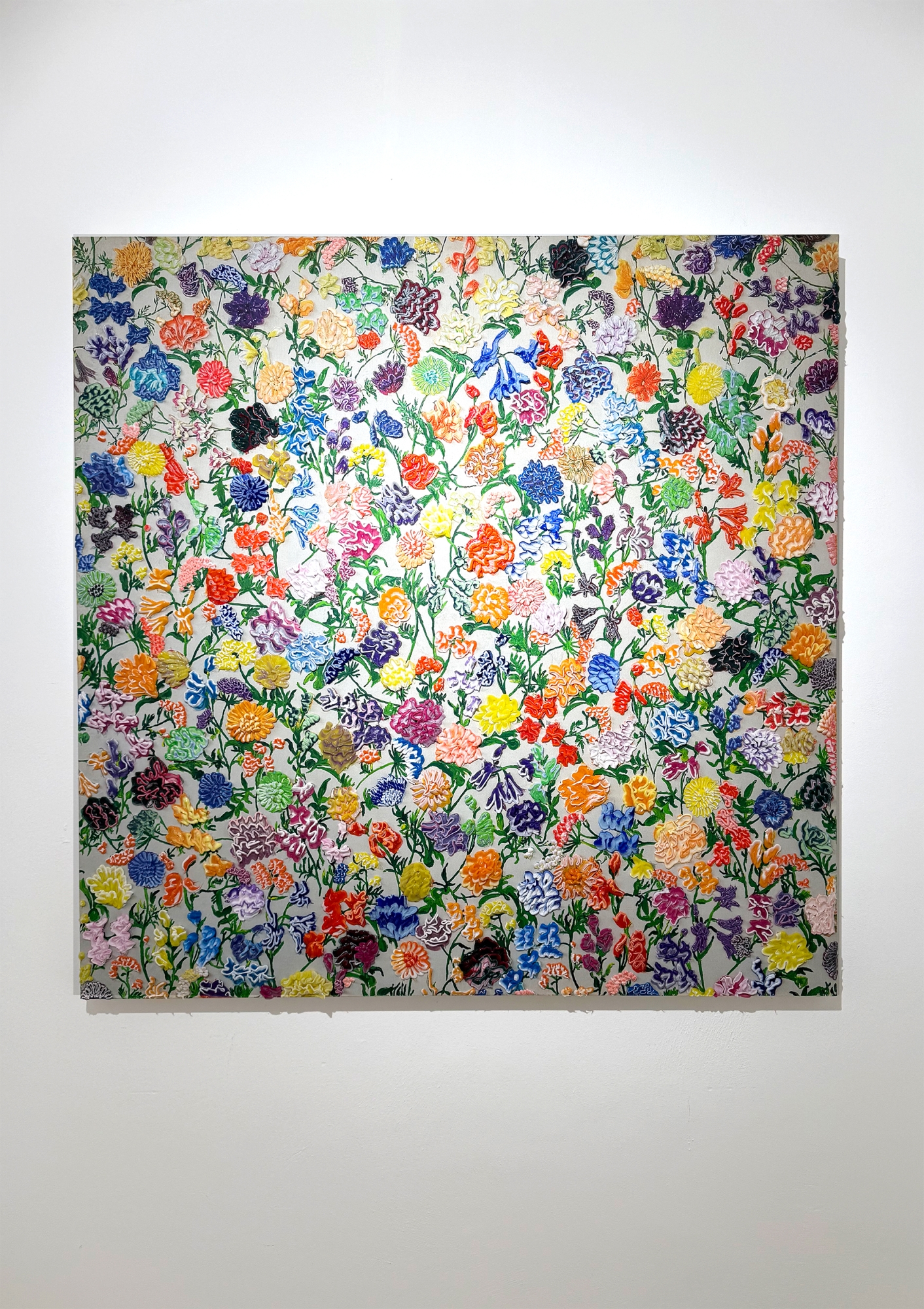 Techniek:Acryl, silicone en borduurwerk op bedrukte stof