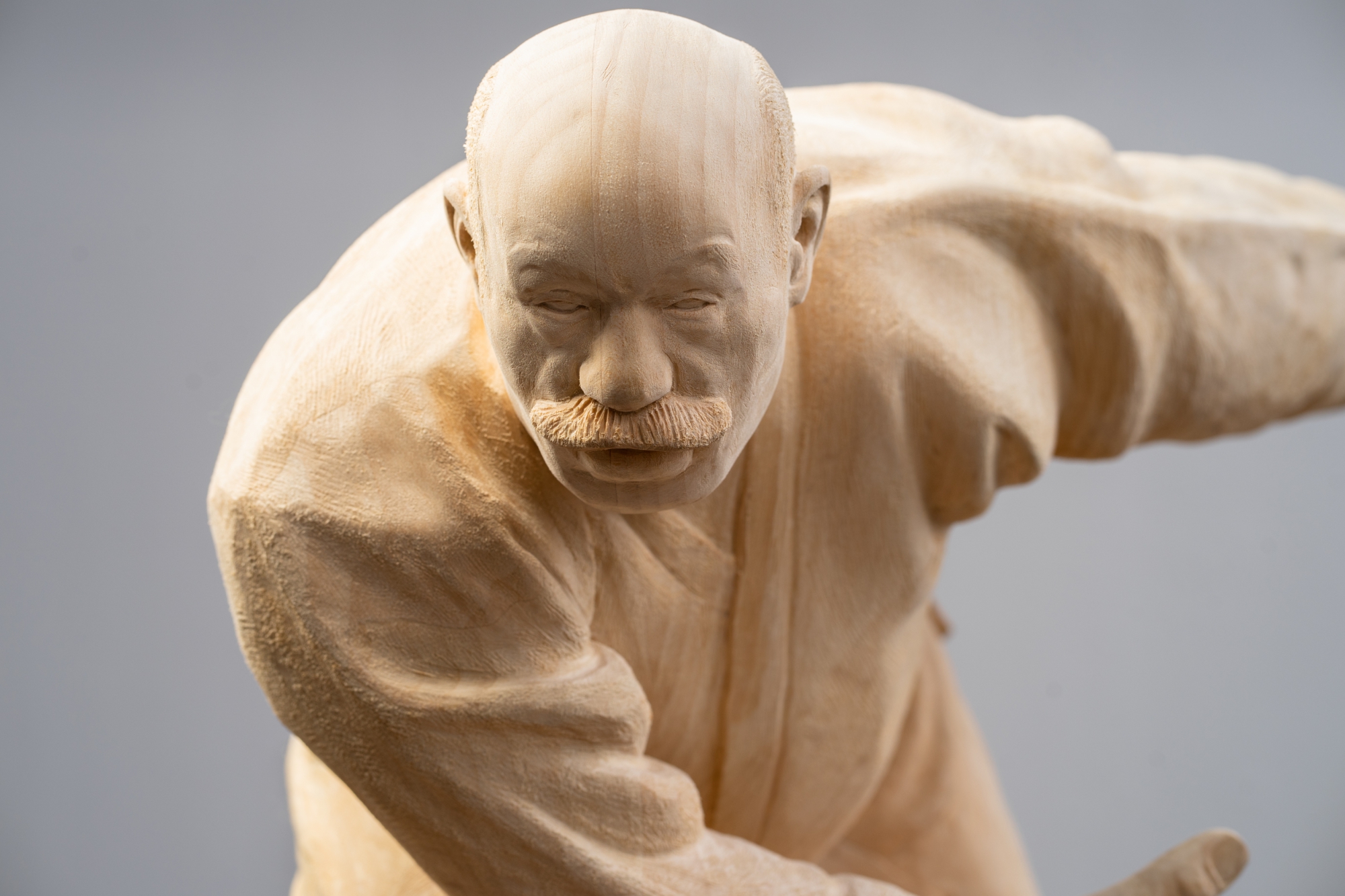 Mas is een judoka van 80 jaar oud uit Rotterdam. Met zijn markante snor en postuur is hij een opvallend persoon binnen de judowereld. Hij voert de 'Yonhon me' kata uit. Deel van de 'Itsutsu no kata' (terwijl de zee de kust schoonveegt). Ik was enorm geraakt door de sierlijke kracht waarmee hij de kata's uitvoert. Ik heb hem daarom gevraagd om voor mij te poseren. Het beeld is uit één blok (verlijmd) lindehout gesneden.