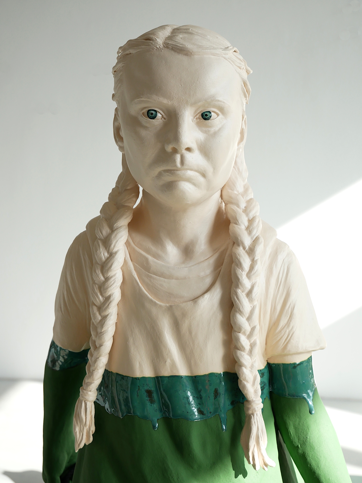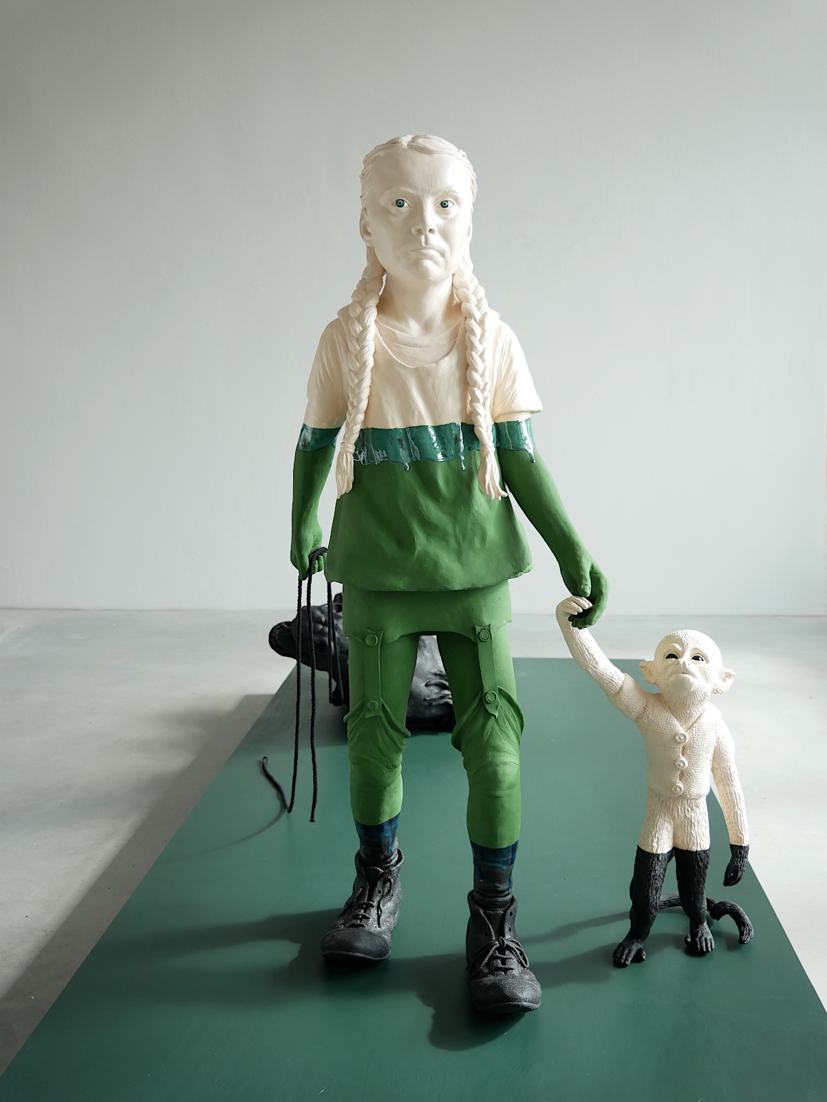 Deze installatie toont twee Zweedse heldinnen samengevoegd in één beeld. Het onschuldige verhaal van Pippi Langkous en de verbeten strijd van Greta Thunberg. Pippi, heldin van velen die opgegroeid zijn in de jaren ’70, is een onverschrokken, non-conformistisch meisje dat opgroeit in een maatschappij die optimisme en vrijheid biedt. Greta is van nu en leeft in een maatschappij die niet meer zo eenvoudig lijkt te zijn als toen en waarin grote maatschappelijke vraagstukken ons allen in verwarring brengen. Diep onder de indruk van haar vastberadenheid om ten strijde te trekken als klimaatactiviste, heb ik haar in dit werk een podium gegeven om haar strijd te ondersteunen. Vergezeld van haar trouwe dieren, het aapje meneer Nilsson en paard Witje stapt ze dapper voort als voorvechter voor het klimaat in een wereld die in brand staat. Mariëtte van der Ven